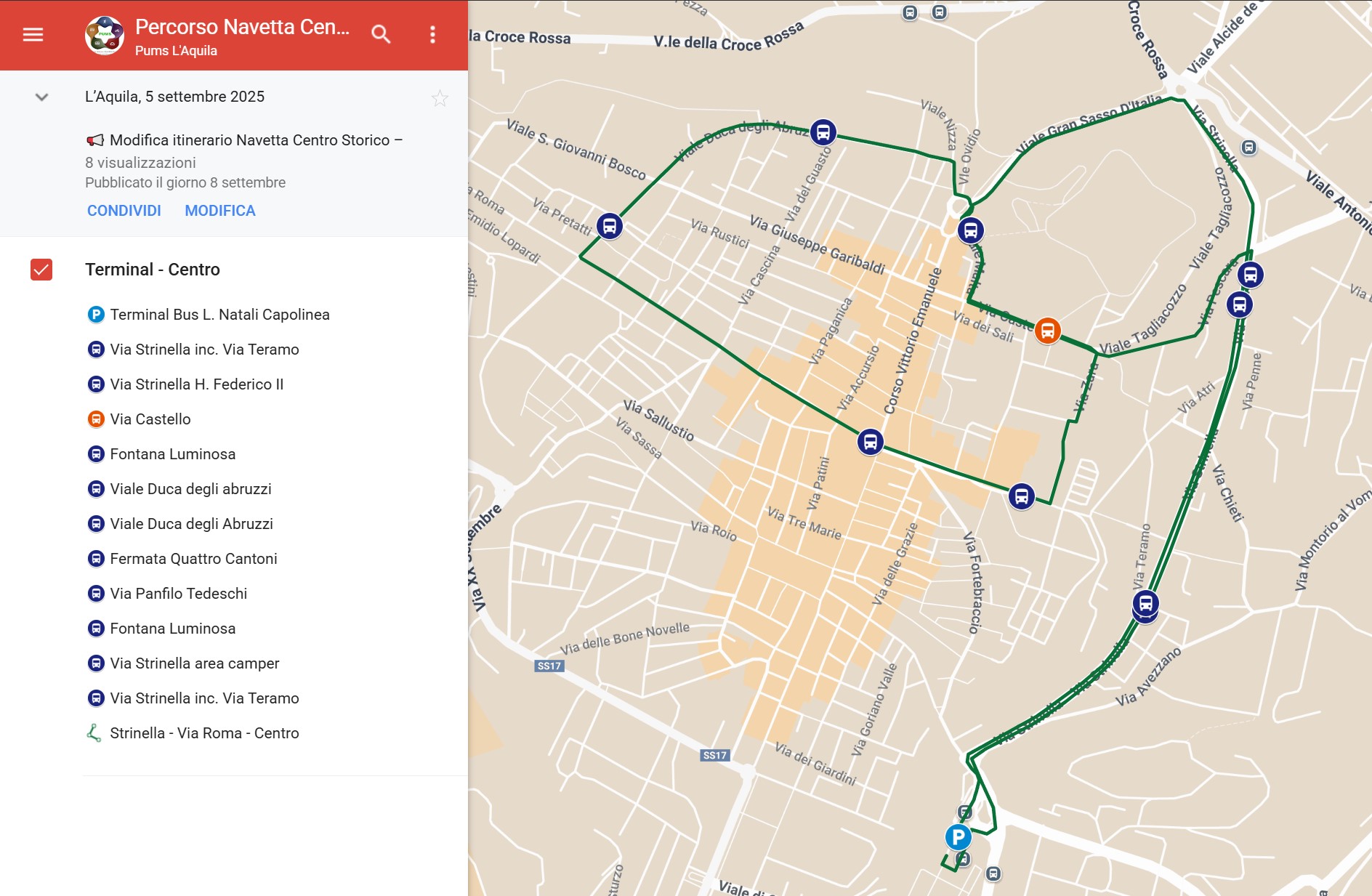 Terminal bus – Via Strinella – Via Pescara – Via Castello Piazza Battaglione degli Alpini – Viale Nizza – Viale Duca degli Abruzzi – Via Roma – Piazza Palazzo – Via San Bernardino – Via Zara – Via Castello – Viale Gran Sasso d’Italia – Via Strinella – Terminal bus