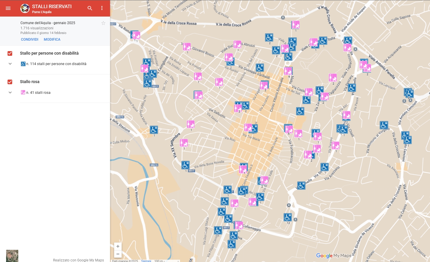 Al seguente link è possibile consultare la mappa interattiva degli stalli riservati ai disabili e gli stalli rosa: